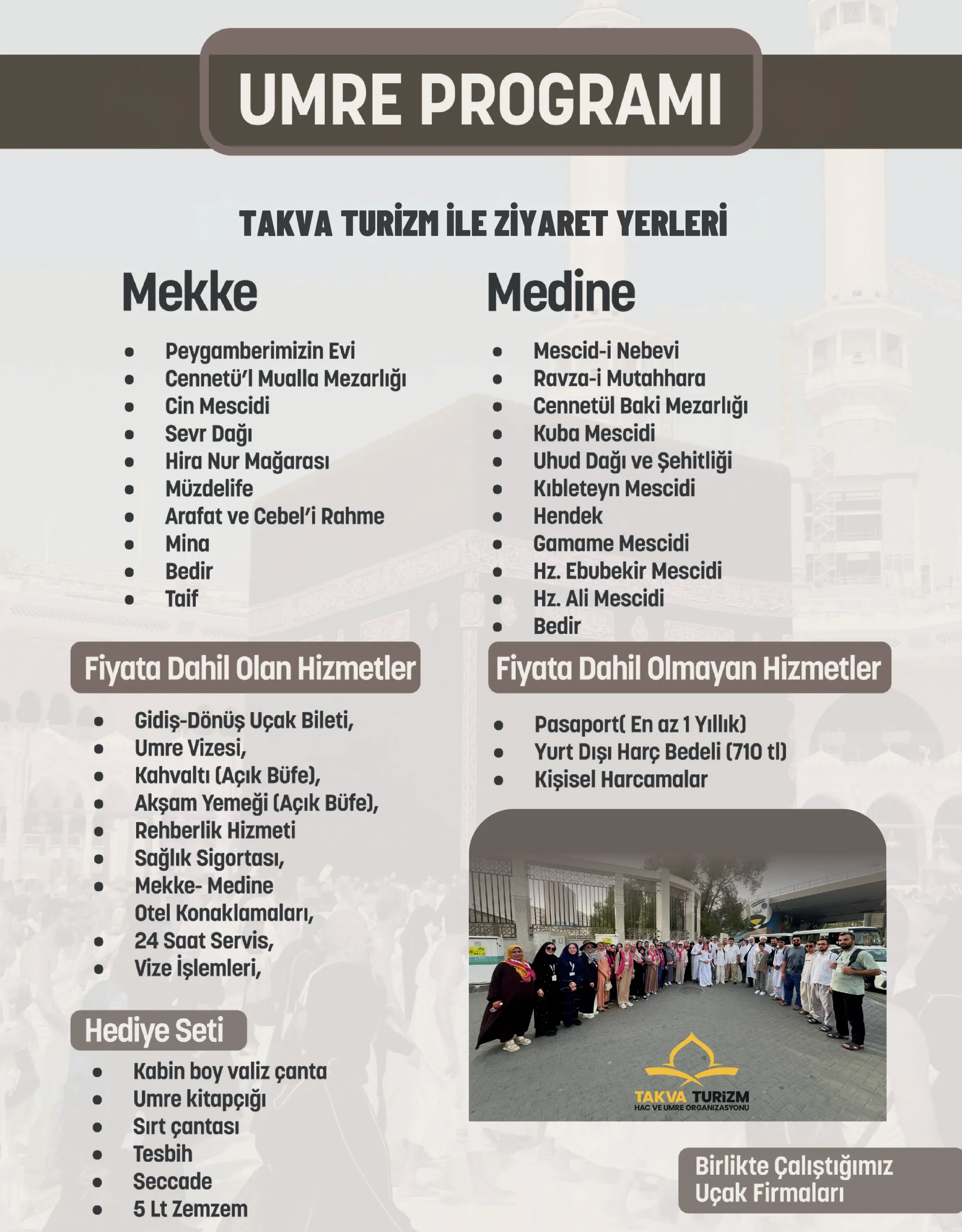 TEMMUZ UMRESİ UMRE TURU FİYATLARA DAHİL OLAN HİZMETLERİMİZ